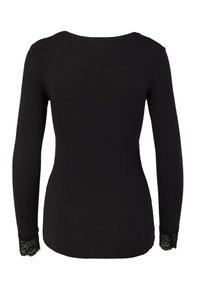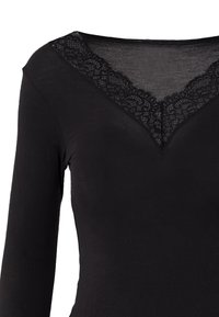 Schwarzes Langarmoberteil mit V-Ausschnitt und Spitzenverzierung. Hergestellt aus einem leichten Material, mit Spitzenakzenten an den Manschetten.