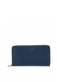 Schwarzes Lederportemonnaie mit strukturierter Oberfläche, goldenen Beschlägen und einem Reißverschlussverschluss mit einem kleinen Zugtab. Der Markenname ist geprägt.