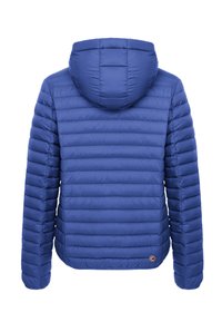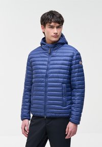 Junger Mann trägt eine blaue, gesteppte Kapuzenjacke mit seitlichen Taschen und steht vor einem schlichten hellen Hintergrund.