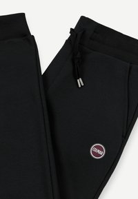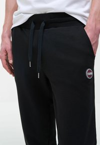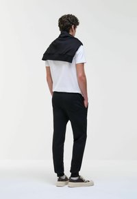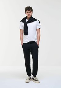 Mann trägt schwarze Jogginghose mit Kordelzug und schwarz-weißen Sneakern, steht mit den Händen in den Taschen vor weißem Hintergrund.