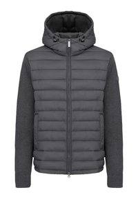 Grüne gepolsterte Jacke mit abnehmbarem Kapuzenan, gerippten Strickärmeln und einem durchgehenden Reißverschluss, ausgestattet mit zwei Seitentaschen und einem strukturierten Muster.