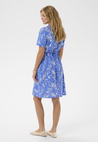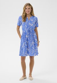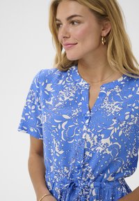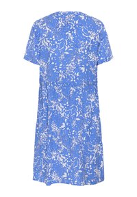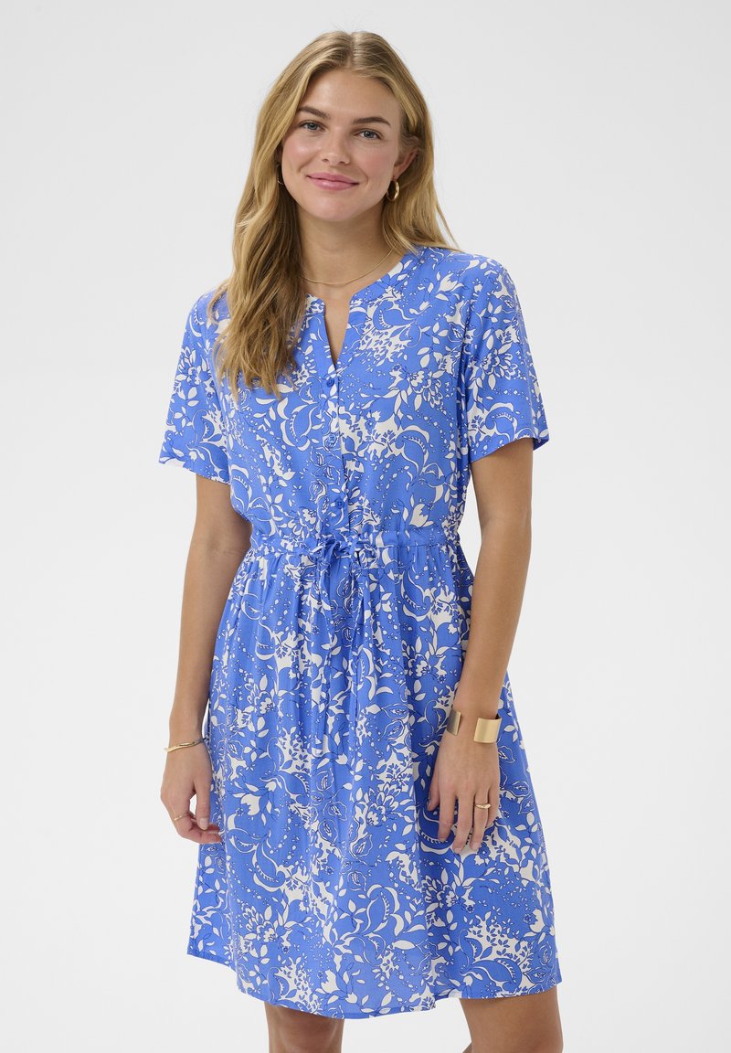 Frau mit langen blonden Haaren, die ein kurzärmeliges blaues Kleid mit weißen Blumenmustern trägt, steht vor einem schlichten hellen Hintergrund.