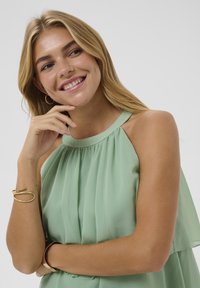 Junge Frau in einem mehrlagigen, ärmellosen mintgrünen Kleid mit Neckholder-Ausschnitt, Goldarmband und Creolen, stehend vor einem schlichten Hintergrund.