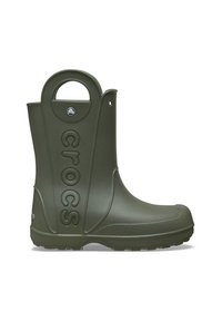 Rosa wasserdichte Gummistiefel mit erhöhtem Rand, abgerundeter Zehenform, strukturiertem Sohle und "crocs"-Logo an der Seite. Mit seitlichem Griff für leichtes An- und Ausziehen.