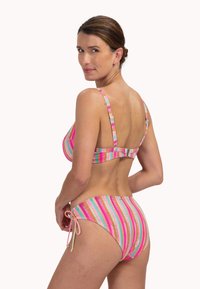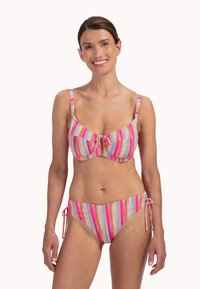 Frau trägt ein Bikini-Oberteil mit dünnen Trägern und einer vorderen Knotenbindung in pink, orange, blau und weiß gestreift, lächelt mit sichtbaren Zähnen.