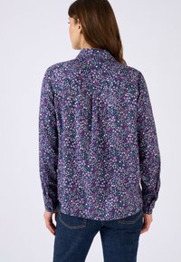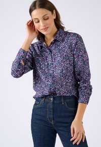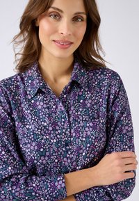 Bluse mit Knopfleiste in Dunkellila mit rosa und grünen Mustern. Lange Ärmel, Kragen und lockere Passform. Kombiniert mit blauen Jeans.