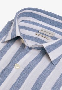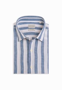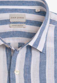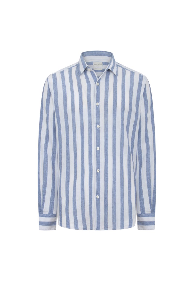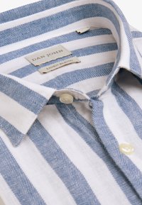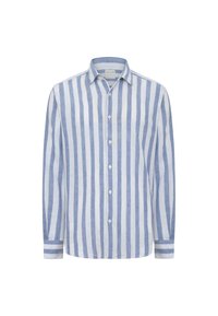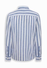 Langärmliges Hemd mit Knöpfen, vertikalen blauen und weißen Streifen und einem Kragen.