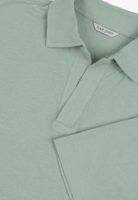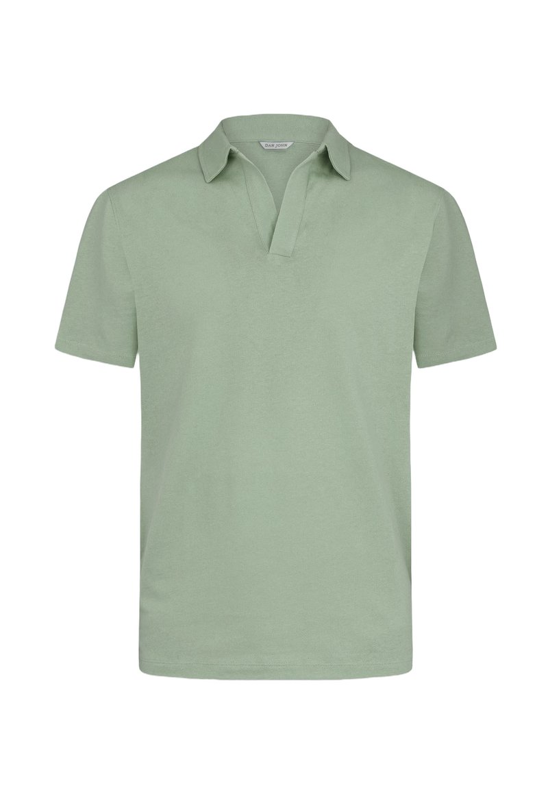 Hellgrünes kurzärmeliges Polohemd mit offenem Kragen und ohne Knöpfe, auf weißem Hintergrund dargestellt.
