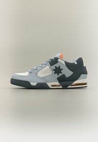 Niedriger Sneaker in Hellgrau und Weiß mit schwarzem Sternlogo, orangefarbenem Zungenakzent, perforierten Einsätzen und gepolsterter Sohle.