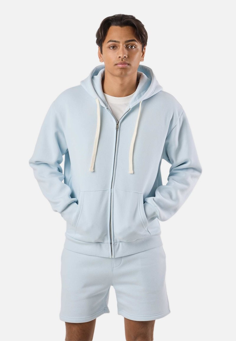 Junger Mann trägt eine hellblaue Kapuzenjacke mit Reißverschluss und passende Shorts, steht mit den Händen in den Taschen vor einem schlichten weißen Hintergrund.