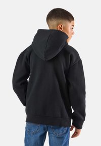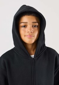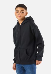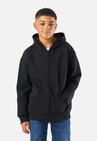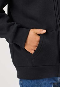 Junge steht entspannt mit Händen, trägt schwarzen Kapuzenpullover mit Reißverschluss, weißes T-Shirt, blaue Jeans und weiße Sneakers mit Kautschuksohlen.