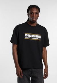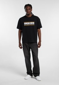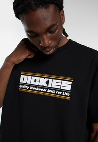 Schwarzes Baumwoll-T-Shirt mit einem auffälligen weißen und gelben "DICKIES"-Logo, kurzen Ärmeln und einem lockeren Schnitt. Einfacher, strukturierter Stoff.
