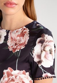 Oberteil mit Blumendesign und kurzen Ärmeln, das große rosa Pfingstrosen auf schwarzem Hintergrund zeigt; zackiger Saum ergänzt das Design.