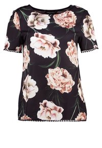 Schwarze Bluse mit Blumenmuster, aus transparentem Stoff, mit rundem Ausschnitt und Trompetenärmeln, verziert mit pinken und blauen Blumenmustern. Kombiniert mit blauen Jeans.