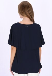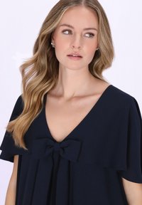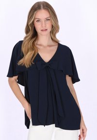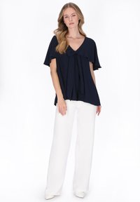 Junge Frau mit langen blonden Haaren, trägt eine marineblaue Bluse mit Schleife und kurzen Rüschenärmeln, kombiniert mit weißen Hosen.