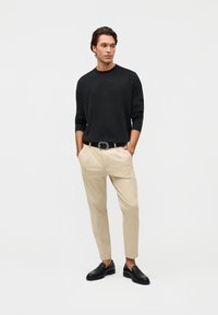Mann trägt beige, maßgeschneiderte Hose mit Gürtelschlaufen, Falten, schwarzen Slippern und einem langärmligen schwarzen Hemd, steht vor weißem Hintergrund.