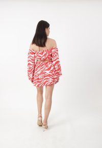 Frau in korallfarbenem und weißem Zebra-Print Off-Shoulder Crop-Top und passendem Wickelrock, beige Absatzsandalen, vor weißem Hintergrund stehend.