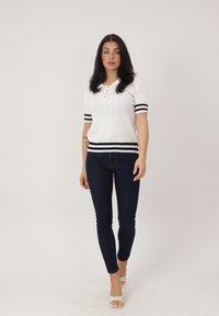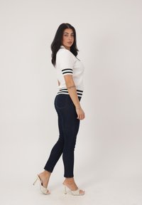 Frau mit langen dunklen Haaren steht mit den Händen in die Hüften gestützt, trägt ein weißes Strickoberteil mit kurzen Ärmeln und schwarzen Streifen sowie dunkle Skinny-Jeans und weiße High Heels.