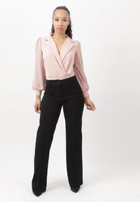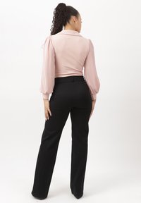 Frau steht vor weißem Hintergrund in rosa Bluse mit langen Ärmeln und aufgebauschten Schultern sowie schwarzer, hoch taillierter Hose.