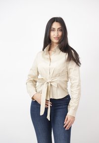 Junge Frau steht vor einem schlichten Hintergrund, trägt eine hellblaue, zum Binden am Taillenbereich geknöpfte Bluse und dunkelblaue Jeans.