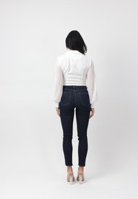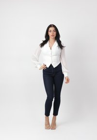 Frau mit langen dunklen Haaren, die nach vorne geht und eine weiße Weste mit Knöpfen und transparenten Ärmeln, dunkle enge Jeans und klare High-Heels trägt.