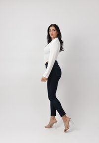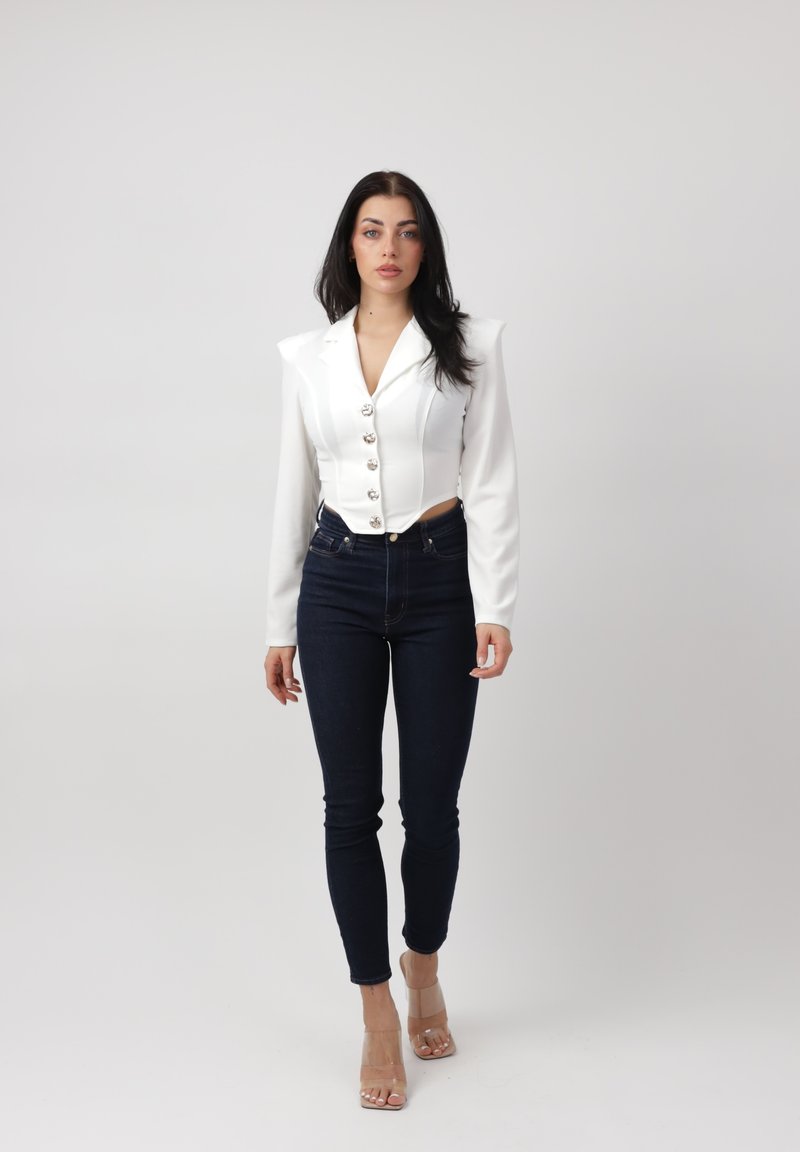 Frau mit langen dunklen Haaren trägt weißen taillierten Blazer mit silbernen Knöpfen, dunkle Skinny-Jeans und klare Sandalen mit hohen Absätzen, steht vor grauem Hintergrund.