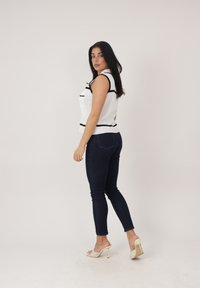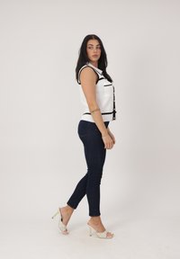 Frau mit langen dunklen Haaren, die ein weißes, ärmelloses Hemd mit schwarzen Kanten, dunkle Skinny-Jeans und weiße offene Absatzschuhe trägt, steht vor weißem Hintergrund.
