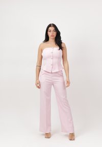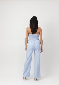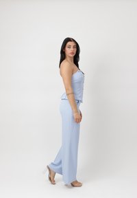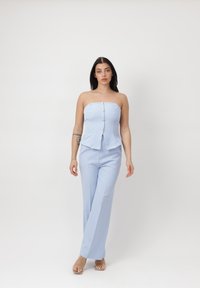 Frau steht vor einem einfarbigen Hintergrund, trägt ein hellblaues, schulterfreies, geknöpftes Top mit passenden weit geschnittenen Hosen und durchsichtigen High Heels.