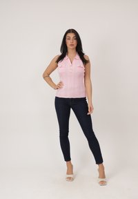 Frau mit langen dunklen Haaren, die ein ärmelloses rosa Oberteil mit Knöpfen, dunkle enge Jeans und weiße offene Sandaletten vor einem einfarbigen Hintergrund trägt.