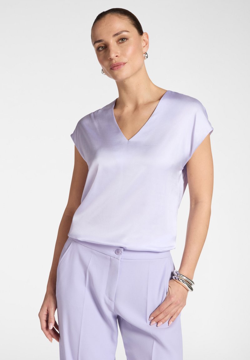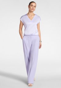 Frau trägt eine hellviolette V-Ausschnitt-Bluse mit kurzen Ärmeln und passende hochgeschnittene Hose, dazu silberne Creolen und Armreifen als Accessoires.