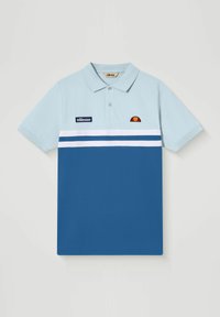 Junger Mann trägt ein navyblaues ellesse-Poloshirt mit hellblauen Streifen und hellblaue Shorts, steht vor einem schlichten hellen Hintergrund.