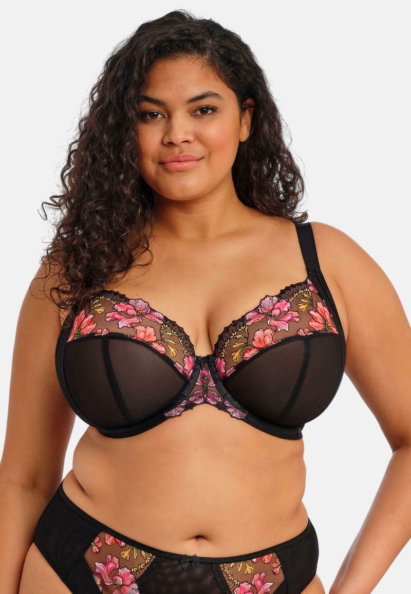 Schwarzer BH mit transparenten floralen Spitzen-Körbchen, rosa-grüner Stickerei und schwarzen Trägern. Passender schwarzer Bikini-Slip mit Spitzenakzenten.