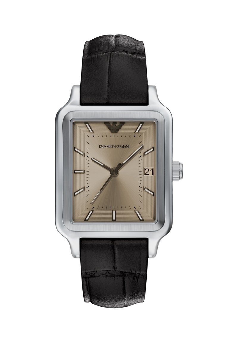 Diese 36 mm große, rechteckige Uhr verfügt über ein japanisches 3-Zeiger-Datumswerk und ein strukturiertes, silberfarbenes Zifferblatt, das von einem bernsteinfarbenen Glas bedeckt ist und so für ein Vintage-Flair sorgt. Das Edelstahlgehäuse und das braune Lederband mit Krokoprägung verleihen dieser Uhr eine moderne Raffinesse, die jedes Ensemble aufwertet.