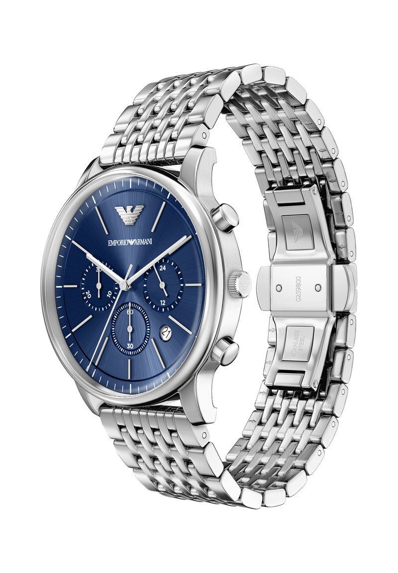 Der 42-mm-Chronograph von Emporio Armani vereint Präzision und modernes Design. Ein faszinierendes blaues Sunray-Zifferblatt unter einem gewölbten Glas harmoniert perfekt mit einem Edelstahlband, während ein dezentes Datumsfenster auf der 4-Uhr-Position dank des japanischen Uhrwerks stets für eine präzise Zeitanzeige sorgt.
