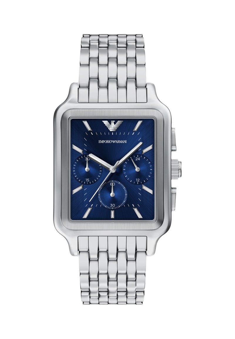 Diese rechteckige 38-mm-Uhr verfügt über ein japanisches Chronographenwerk und ein strukturiertes blaues Sunray-Zifferblatt mit eleganten Edelstahlakzenten. Mit ihrem Edelstahlband und der Faltschließe bietet diese Uhr moderne Raffinesse, die jedes Ensemble aufwertet.