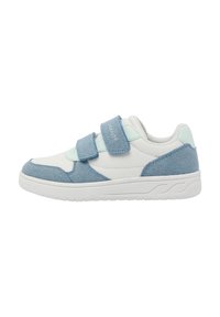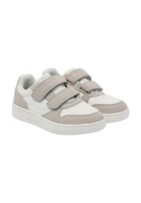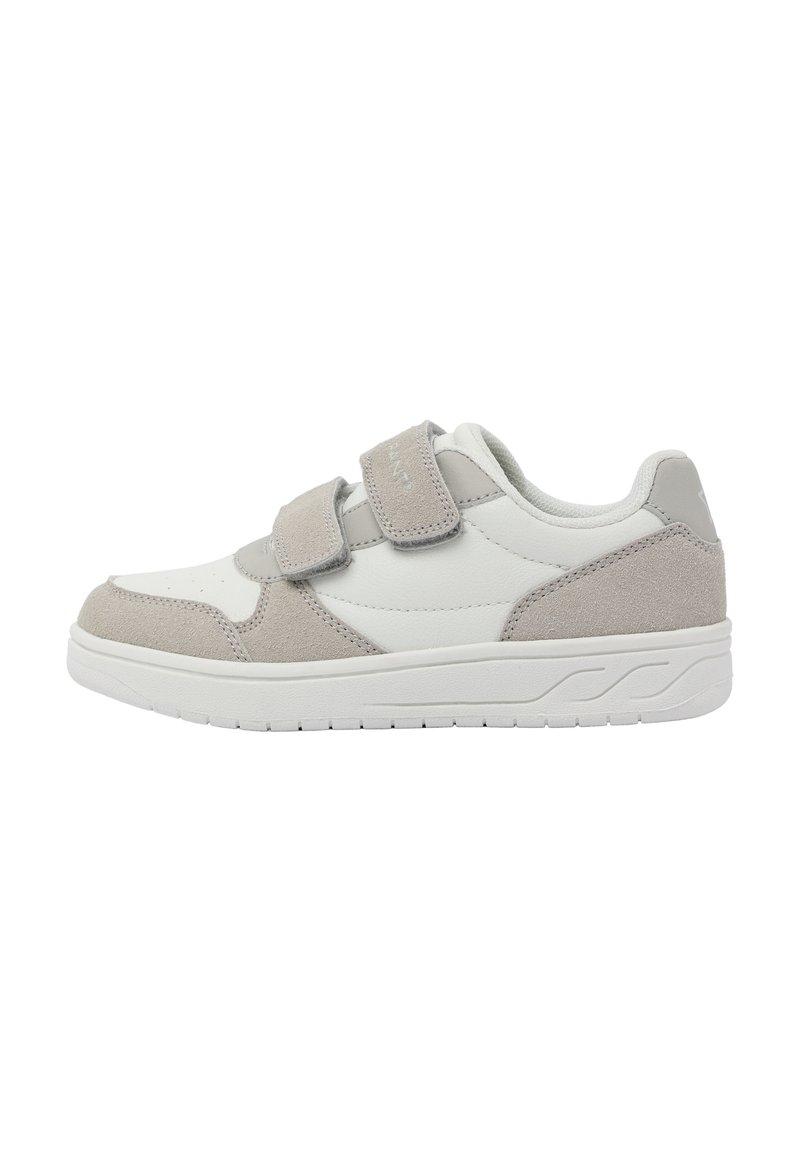 Leichte Sneakers mit einem weißen Lederobermaterial, grauen Wildlederakzenten und zwei Klettverschlüssen, die für einfaches An- und Ausziehen sowie Komfort sorgen.