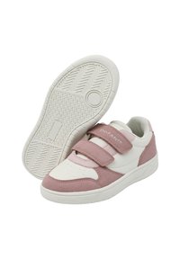 Rosa Hose mit Blumenmuster, elastische Bündchen und rosa Pulloverärmel. Hellrosa und weiße Sneaker mit Klettverschlüssen und strukturierten Akzenten.