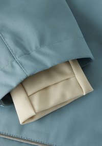 Wasserabweisende blaue Jacke mit Kapuze, beigem Innenfutter, zwei Fronttaschen und kontrastierenden Bündchen. Verfügt über einen Reißverschluss und abgestepptes Detail.