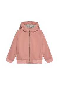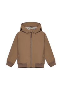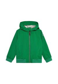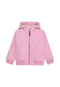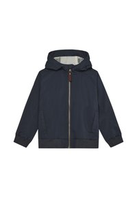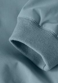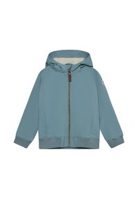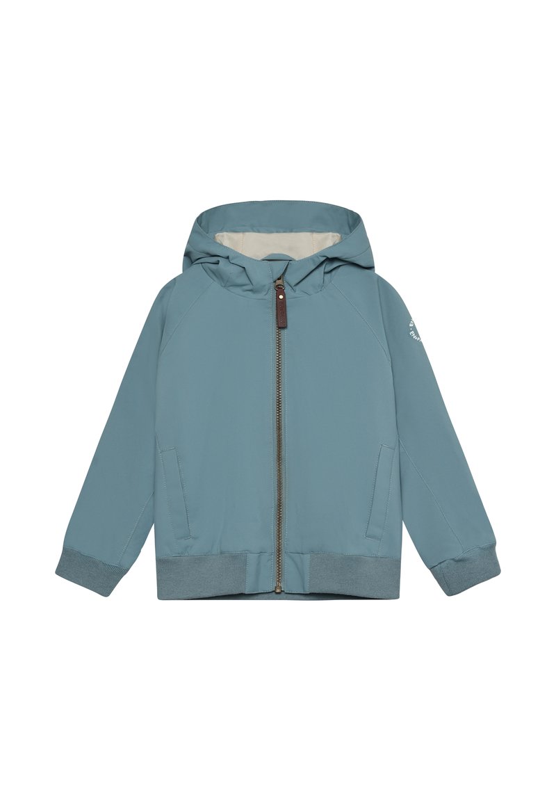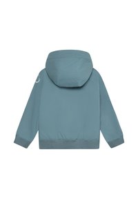Hellblauer Kapuzenjacke mit einem vorderen Reißverschluss, elastischen Bündchen und Saum. Verfügt über Seitentaschen und ein cremefarbenes Innenfutter.