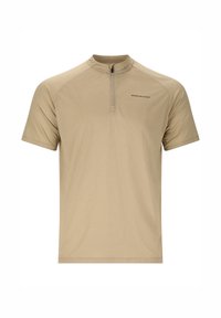 Kurzärmliges, graues Sportshirt mit halbem Reißverschluss und Kragen, kombiniert mit großen, bläulich getönten Sonnenbrillen. Glatte Textur, leichtes Material.