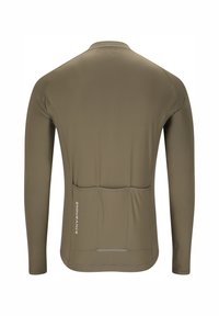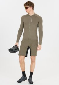 Junger Mann in olivgrünem Fahrrad-Outfit und rot getönten Sportsonnenbrillen, der einen schwarzen Fahrradhelm in einer Hand hält.