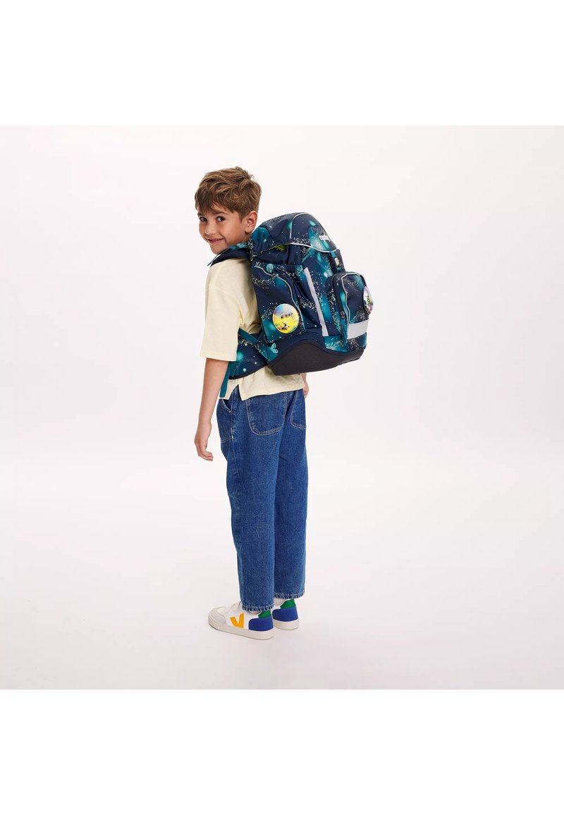 Junger Junge trägt einen marineblauen Rucksack mit Sternenmuster und reflektierenden Aufnähern, beige T-Shirt, blaue Jeans und weiße Sneakers mit gelben Details.