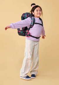 Kind trägt gestreifte Hose und lila Sweatshirt mit großem buntem Rucksack, Arme ausgestreckt, steht vor beigem Hintergrund.
