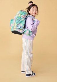 Junges Mädchen lächelt, trägt einen großen pastellfarbenen Batik-Rucksack, ein lila Sweatshirt, gestreifte Hose und Turnschuhe vor einem beigen Hintergrund.