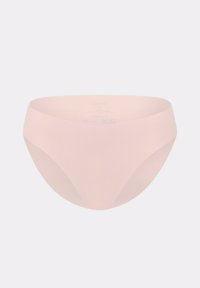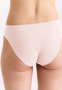 Frau trägt hellrosa Unterwäsche, zeigt Rosen-Tattoo am linken Oberschenkel und "FOREVER"-Tattoo an der rechten Hüfte.