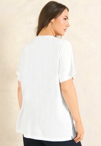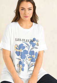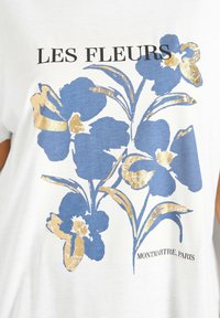 Frau trägt ein weißes oversized T-Shirt mit blauem Blumenmuster und Schriftzug, kombiniert mit weit geschnittenen dunklen Jeans und weißen Sneakers, steht vor weißem Hintergrund.