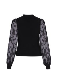 Weißer Pullover mit hohem Kragen und transparenten, bestickten Ärmeln mit Blumenmuster. Kombiniert mit schwarzen Leggings. Glatte Textur.