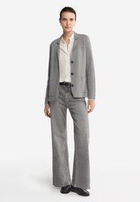 Grau Wolle Sakko mit Reverskragen, schwarzen Knöpfen, zwei vorderen Taschen und figurbetontem Schnitt, kombiniert mit einem weißen Hemd.