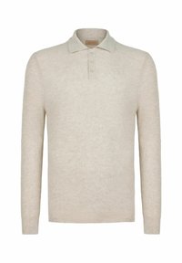 Grauer gerippter Pullover mit langen Ärmeln, einem Kragenhals und einer Knopfleiste mit drei Knöpfen. Hergestellt aus strukturiertem Stoff mit tailliertem Design.