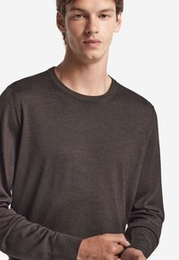 Brauner Langarmpullover mit Rundhalsausschnitt, aus einem weichen, glatten Material gefertigt, mit gerippten Bündchen und Saum für eine enganliegende Passform.